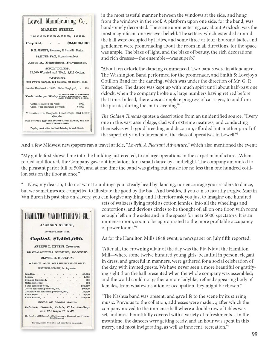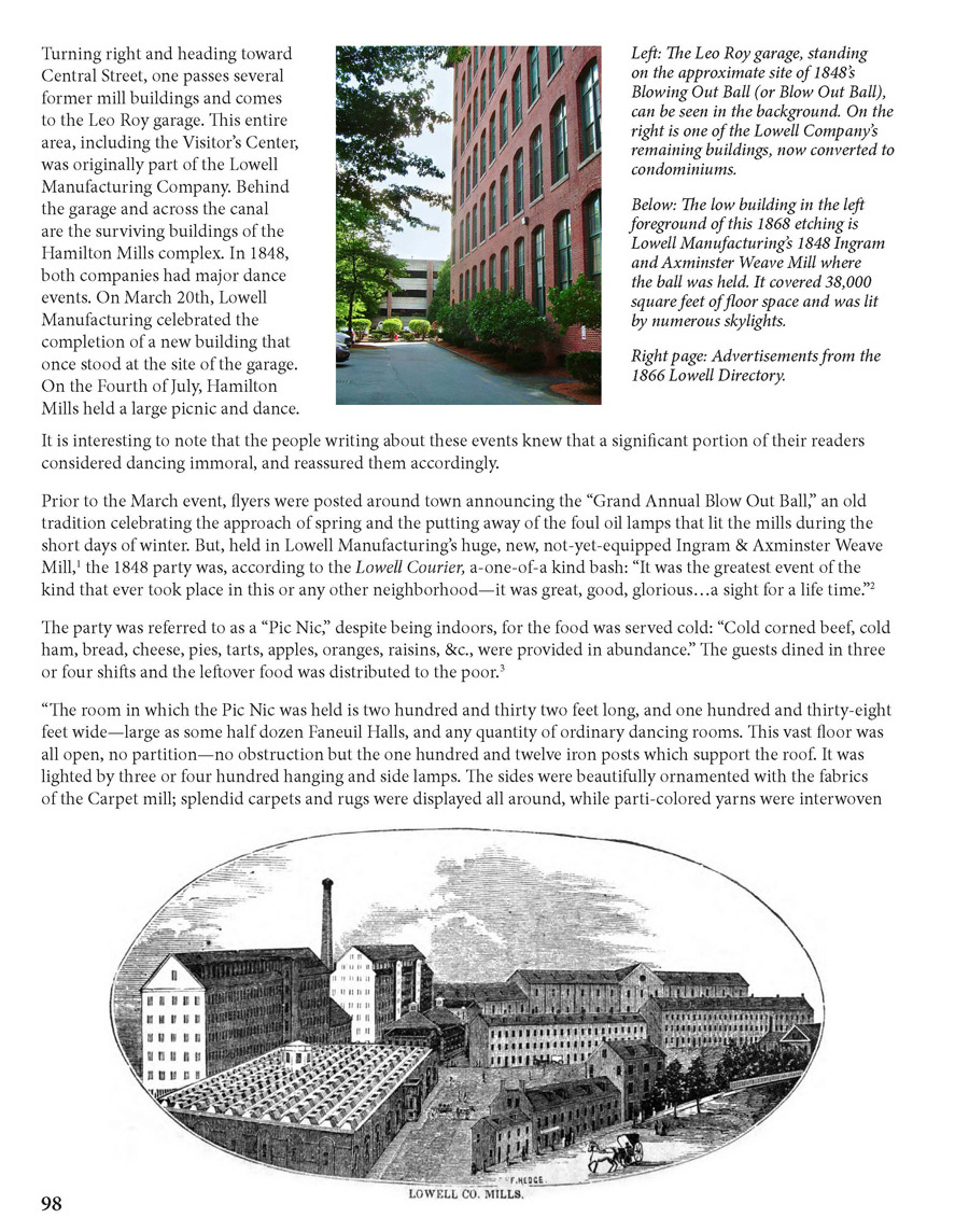 The two pages below are from a chapter about the downtown dance sites of early Lowell. They describe a particularly noteworthy event that took place at the Lowell Manufacturing Co. complex (part of which became Canal Place) in 1848.