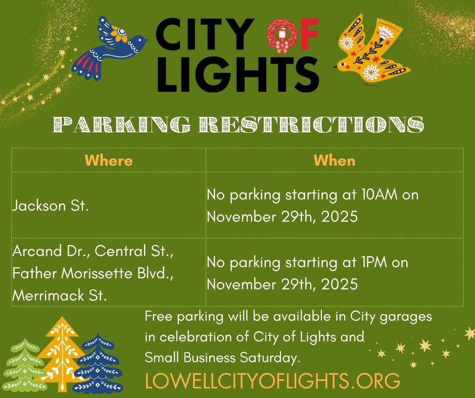 Just a reminder that this Saturday is Lowell’s annual City of Lights Festival and Parade. Lot of things going on downtown beginning at 11:00AM and, of course, the parade starting at 4:30. Lowellma.gov offers some more detailed background for the event.