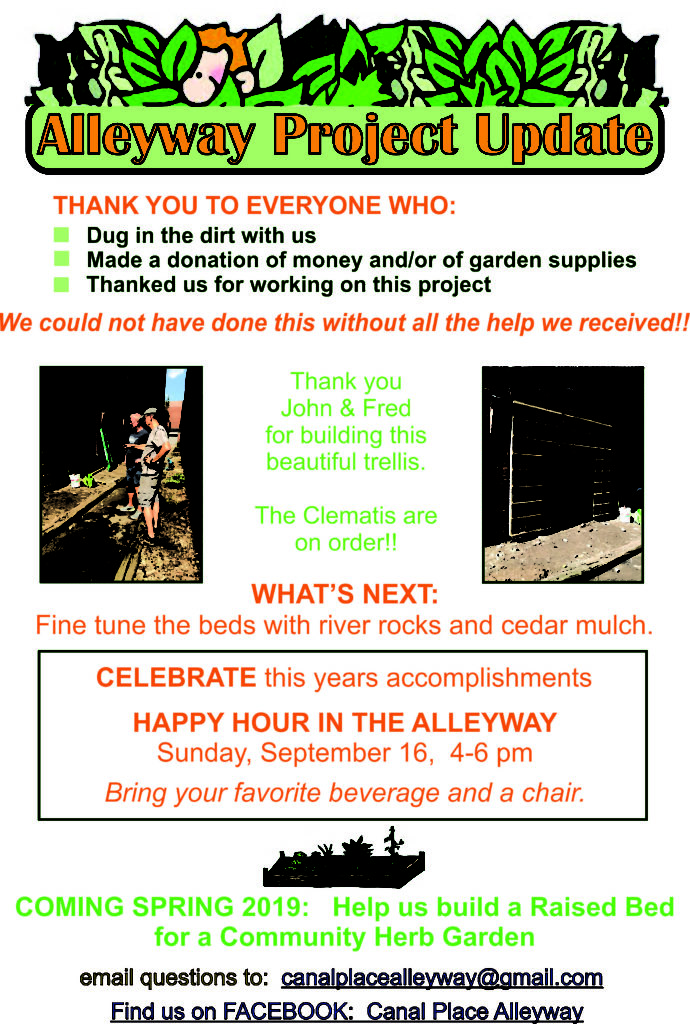 Just a reminder about the gathering in the Alleyway this afternoon from 4 to 6. Bring a chair and a beverage for yourself—extra to share is also welcome if you’re so inclined. Come enjoy a lovely late-summer day with your neighbors!