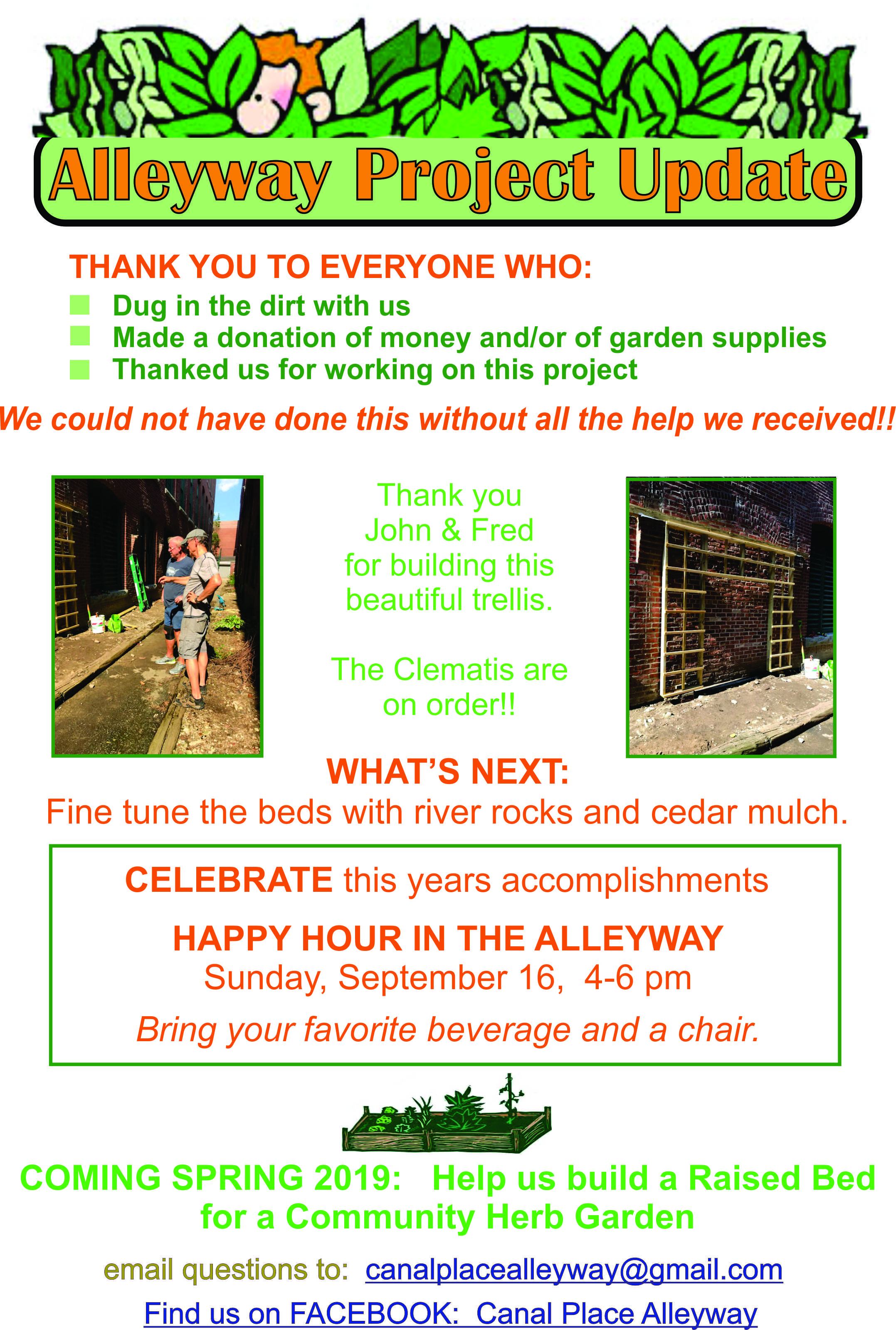Just a reminder about the gathering in the Alleyway this afternoon from 4 to 6. Bring a chair and a beverage for yourself—extra to share is also welcome if you’re so inclined. Come enjoy a lovely late-summer day with your neighbors!