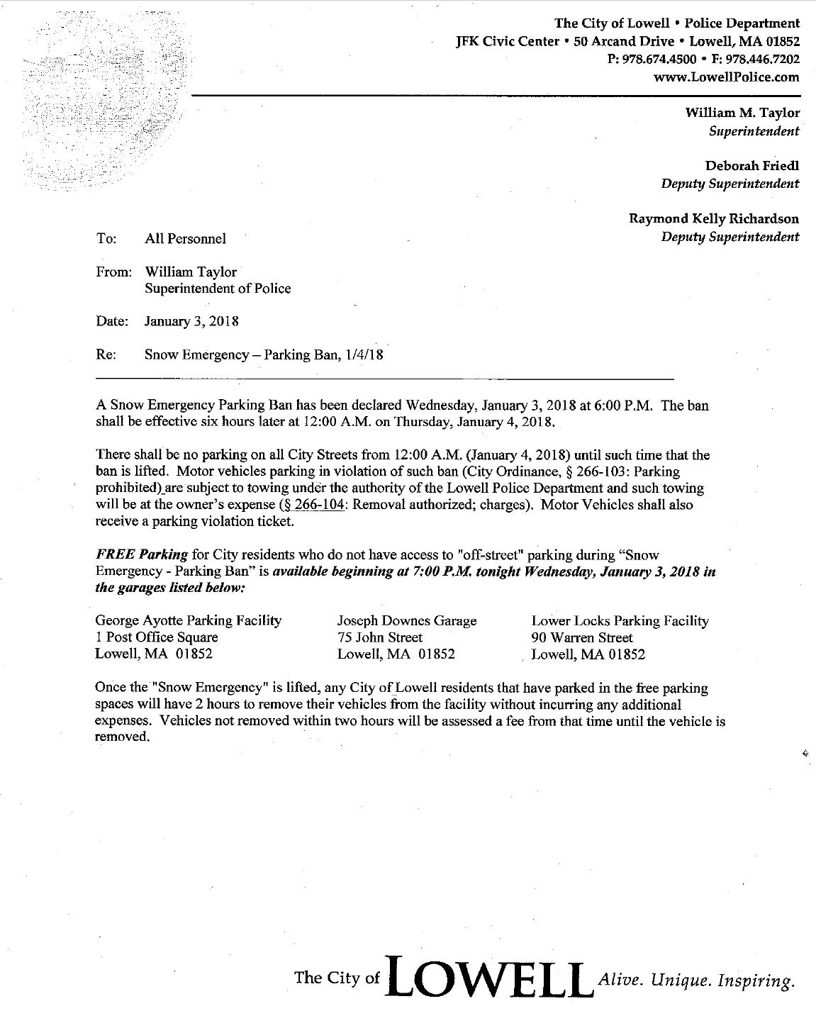 Parking Ban effective at 1PM February 7, 2018. No parking on city streets from 1PM until Parking Ban is lifted. Free parking beginning at 11AM at Ayotte, Downes and Lower Locks garages. Residents will have two hours after ban is lifted to remove vehicles without cost.