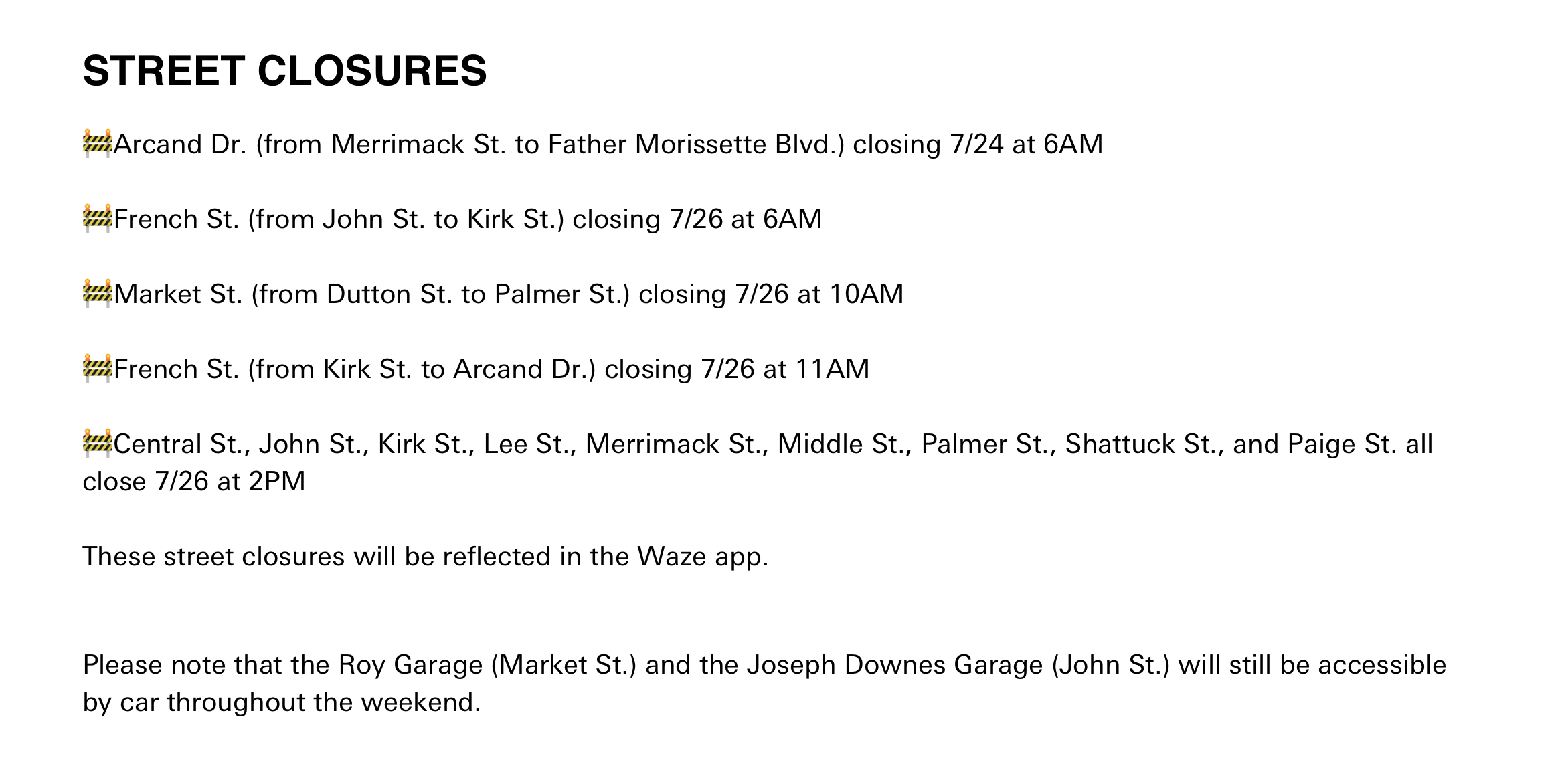 By now, most of the street closures are already in effect, but I’ll paste in a list below. More info about the Lowell Folk Festival can be found online, and there are a number of brochures on the lobby table. It’s a great weekend of food, fun, crafts, music, and dance, with some of it right in our own front yard.