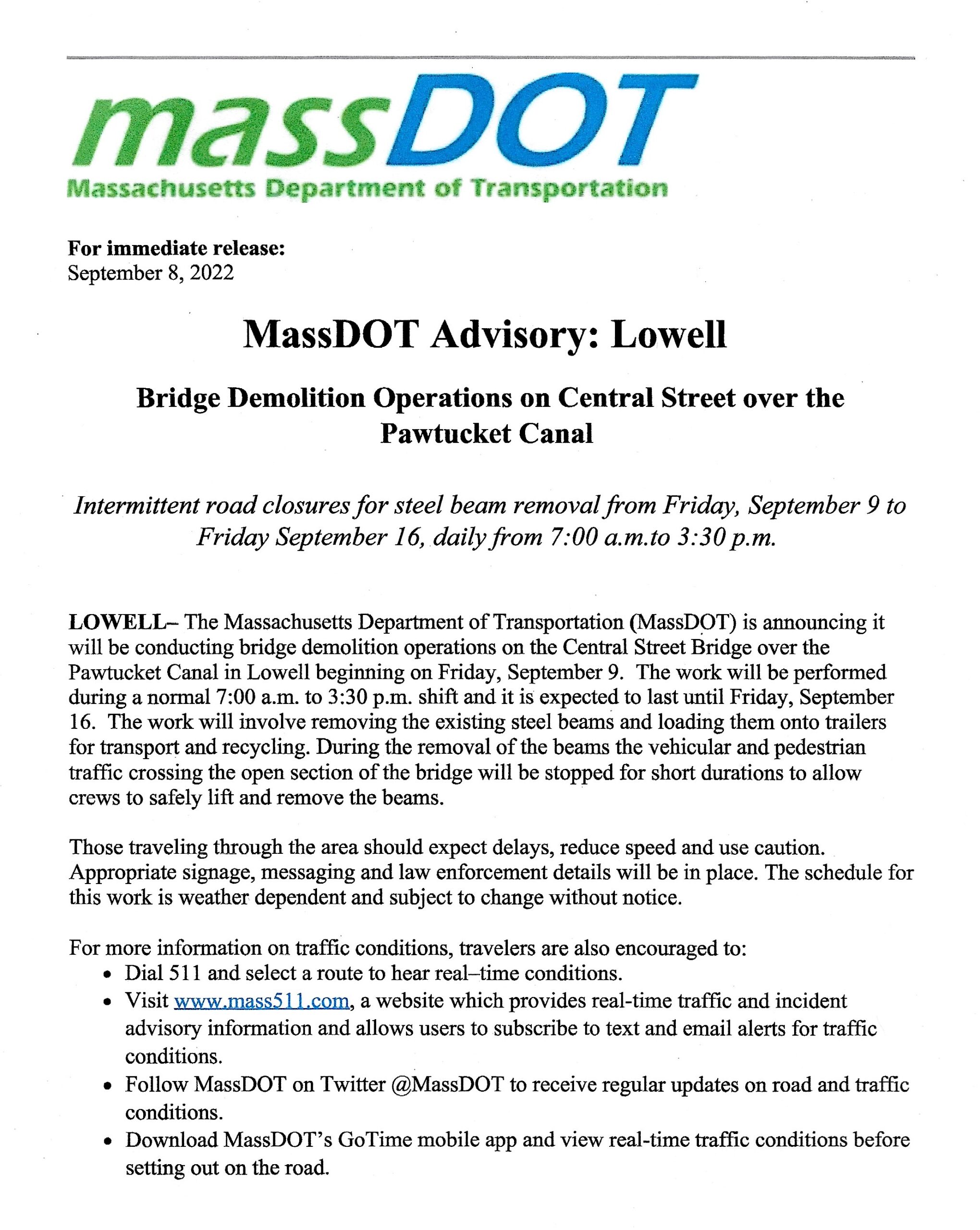 There will be intermittent total shutdowns—including sidewalks—of the Central Street bridge during the coming week, Friday the 9th through Friday the 16th, to allow for the safe removal of existing steel beams as part of the ongoing repair work. Expect delays and use caution. See below for more details.